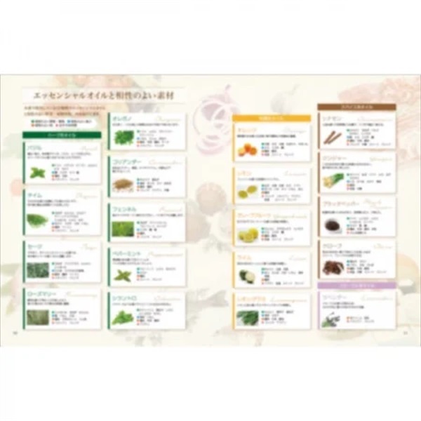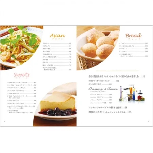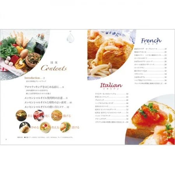 香りで料理をグレードアップ 「美味しそう!」食欲を刺激するうえで、すばやく脳へ伝わる嗅覚は重要なポイントです。香りが料理を美味しくするのです。ハーブやスパイスといった「香り」を演出する素材は、昔から世界中で重宝されています。しかし、料理に合わせてハーブや香辛料を用意するのは、手間もお金もかかります。そこで活躍するのが「エッセンシャルオイル」です。植物由来のエッセンシャルオイルには、ハーブ系やスパイス系、そしてシトラス系があり、お料理に使うのも簡単。少量でも香り豊かなので、使用量も少なく経済的です。 本誌では、純度100%のエッセンシャルオイル19種類を使ったクッキングレシピをまとめました。フランス、イタリア、アジア各国の代表的なお料理とスイーツやブレッド(パン)全42レシピに加えて、ソースやドレッシングのレシピも50種類掲載しております。長くみなさまに愛された一冊をこのたび、お値段を見直しました。エッセンシャルオイルの可能性を楽しんでください!