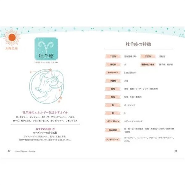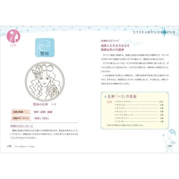 生まれた日の太陽の位置で決まる「太陽星座」や、月の位置を元にした「月星座」の特徴を紹介しているほか、それぞれの星座の個性を発揮するエッセンシャルオイルやおすすめの使い方を公開。さらには、12星座を象徴する「星の女神」をイメージしたオリジナルの「星の女神香油」レシピ12種類も、特別に公開しています。
