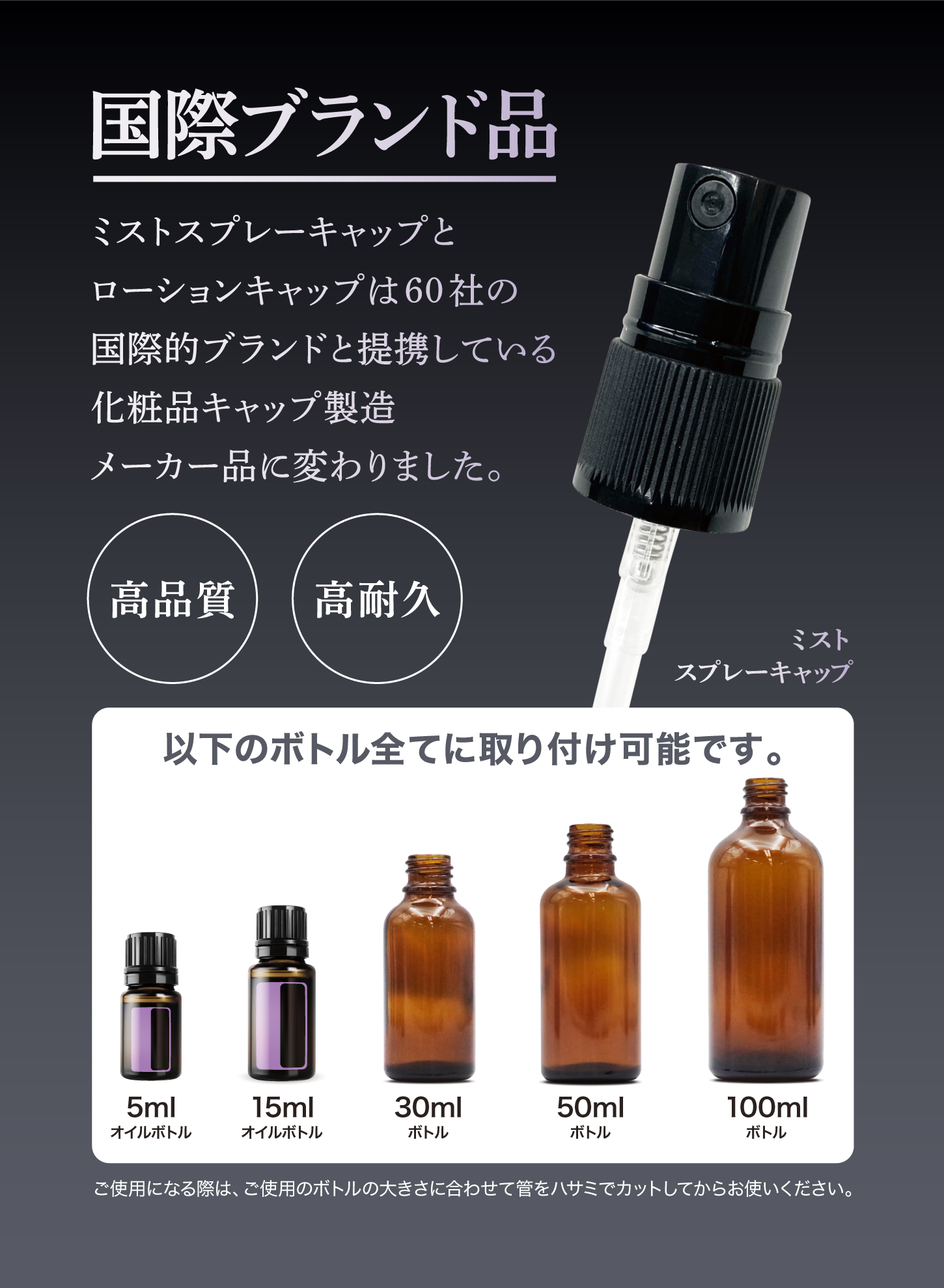 口径18mmの、15ml・30ml・50ml・100mlのボトルすべてに取り付け可能なスプレーキャップです。