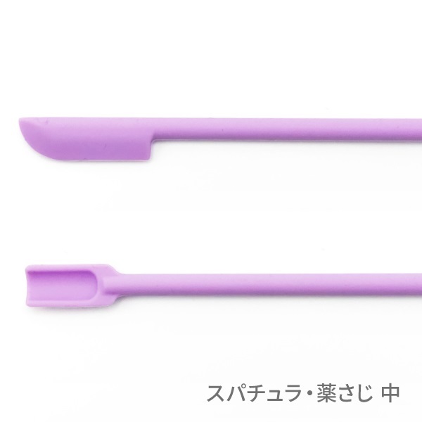 反対側にはサイズごとに形状が異なる薬さじが付いているので、
