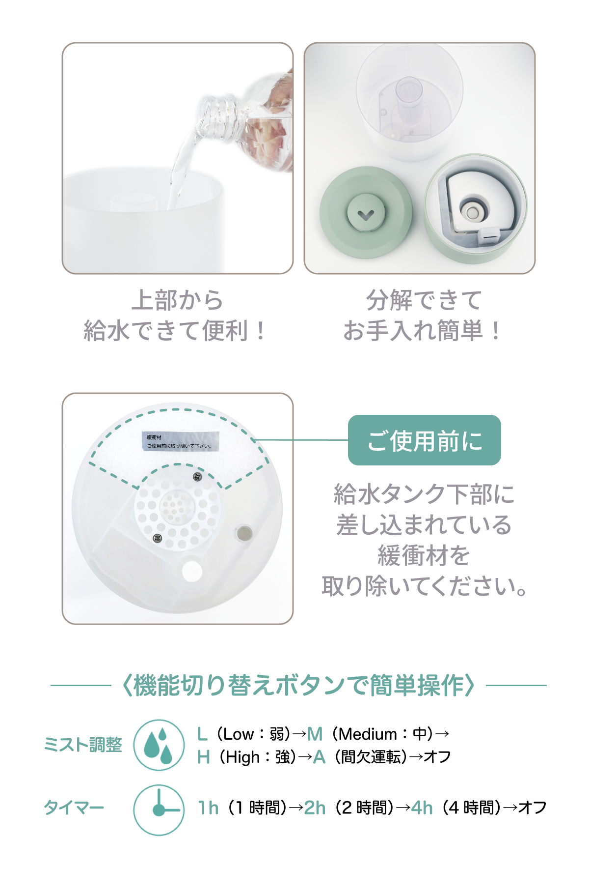 上部給水で重たいタンクの持ち運びがいりません! 超音波加湿器は振動子と呼ばれる装置に、高い周波数の交流電圧を加えて