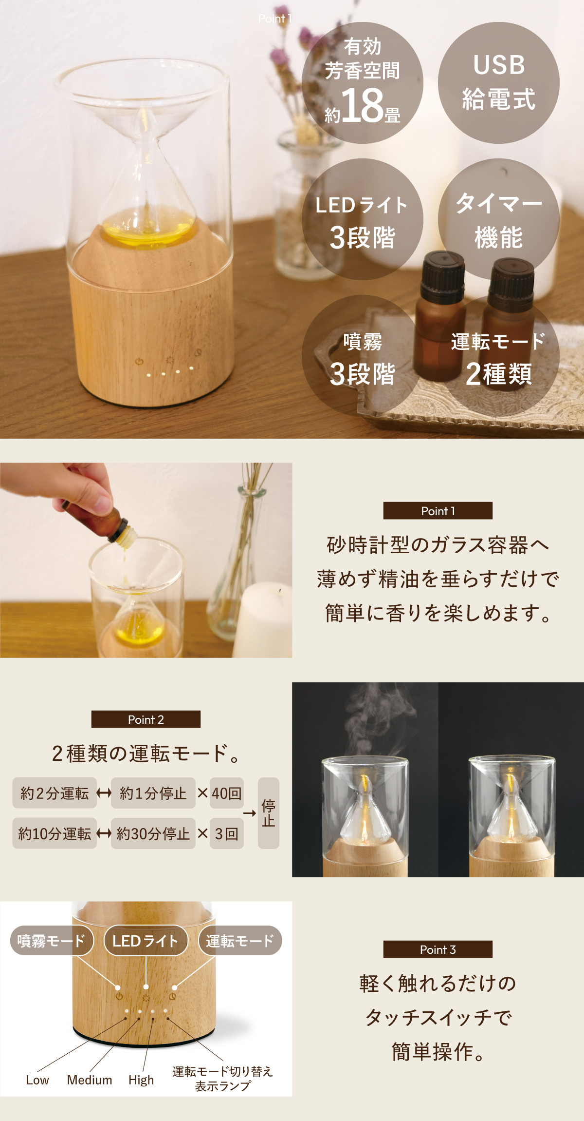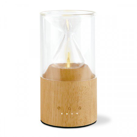 砂時計を模した『ダブルウォールガラス』とLEDの柔らかい灯り、天然木のボティがインテリアに馴染みます。