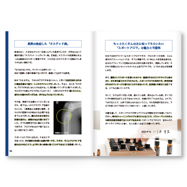 サッカー少年である息子のボディケア、メンタルケアにもアロマテラピーを活用していく中で、エッセンシャルオイルを活用したスポーツアロマケアが話題を呼び、オンラインや全国各地で講座を行っている。